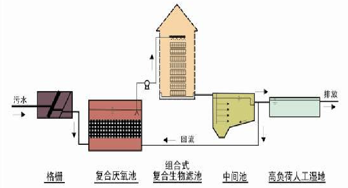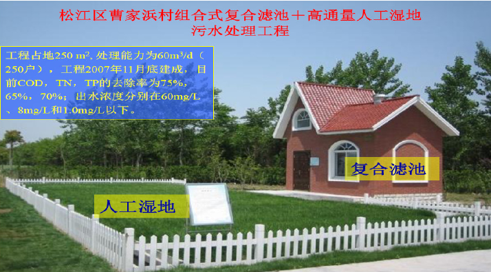 模塊化設計:采用模塊化構建技術,可根據處理水量要求,靈活組裝,適用污水處理量范圍廣(10m3/d一2000m3/d ) 不堵塞:組合式結構,克服了傳統濾池易堵塞的缺點,可長期穩定運行; 污染物處理效率高,效果好:復合濾料強化了系統的處理效果;有機物容積負荷可高達2kg/m3.d; 占地小:60m3/d處理量,設備占地面積約28m2,加人工濕地占地面積約250m2,為傳統人工濕地技術的1/3; 投資省、運行費用低:與傳統的生化處理工藝比較,噸水工程費用可節省1/3以上;運行費用一般不超過0.15元/m3; 能耗低:采用自然通風,不需曝氣,僅需一次水力提升,噸水能耗約0.1kW/h; 管理簡單方便:系統自動運行,不需專人管理,只需定期檢查; 噪音小,無嗅味,環境友好:外觀設計美觀大方,與周圍環境協調一致。 適用于水質水量變化較大的農村生活污水、旅游景區污水、景觀水、湖泊水等的就地處理與回用。 Modular design: adopting modular building technology which may enable assembling in a flexible manner according to water treatment volume. It is applicable for wide scope of sewage treatment volume (10m3/d一2000 m3/d ) No blockage: combined structure which overcomes easy blockage problems of traditional filtration tank and enables long-time running in a stable manner. Small floor occupation: treatment volume of 60m3/d with equipment floor area about 28m. The constructed wetland area is about 250m2 which is only 1/3 compared with traditional constructed wetland area. Low investment and running cost: compared with traditional biochemical treatment process, more than 1/3 engineering cost can be saved for 1 ton of water. The running cost will not exceed RMB 0.15 /m3 in general. Low energy consumption: natural ventilation is adopted with no requirements for aeration. Only one time of hydraulic hoisting is required which may save about 0.1kW/h energy for 1 ton of water. Easy and convenient management: automatic running of the system which does not require management by special person. Only regular inspection is required. Low noise, no smell and environmental-friendly: beautiful appearance design which is harmonious with the environment. It is applicable for on-site treatment and reuse of rural domestic sewage, sewage of tourist attraction, landscape water and lake water with large change in volume and quality. |