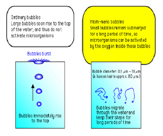 納米氣泡自身的表面具有較強的張力,在水中不斷收縮,后收縮到一定程度則消失溶解于水體中,這是它具有強大溶氧性的原因所在。而且在收縮的過程中,隨著氣泡的縮小,氣泡內的氣壓呈反比例地迅速提高,讓泡內氣體處于超高壓狀態,這種超高壓狀態與超高溫效應結合,是納米氣泡產生超聲波性狀的重要原因所在。因此能長時效進行氧化反應,并殺滅細菌。 The surface of nanobubble has strong tension which may constantly shrink in the water to a certain degree and then disappear in the water body which is the reason of its strong oxygen dissolving ability. The bubble becomes smaller during shrinking process and the air pressure inside the bubble increases quickly in inverse proportion which make the gas inside the bubble under super-high pressure. This super high pressure together with super high temperature effect is the may reason for nanobubble to produce ultrasonic wave. Therefore long-time and effective oxidation reaction and bacteria killing is available. |